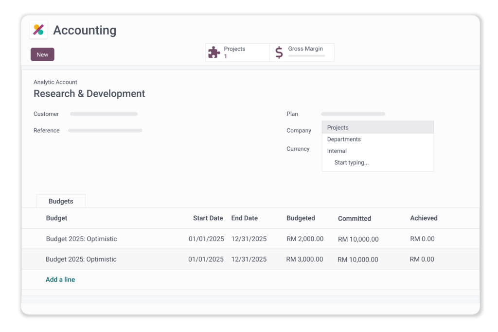 • Budget Management & Analysis: Compare actual expenditures or earnings against the budget set for each analytical account, enabling effective budget control and financial planning.