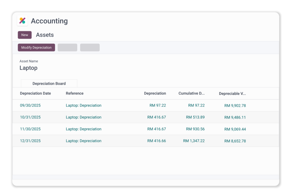 • Significantly reduce manual work and minimize human errors by automating the monthly or yearly write-off of asset values.
