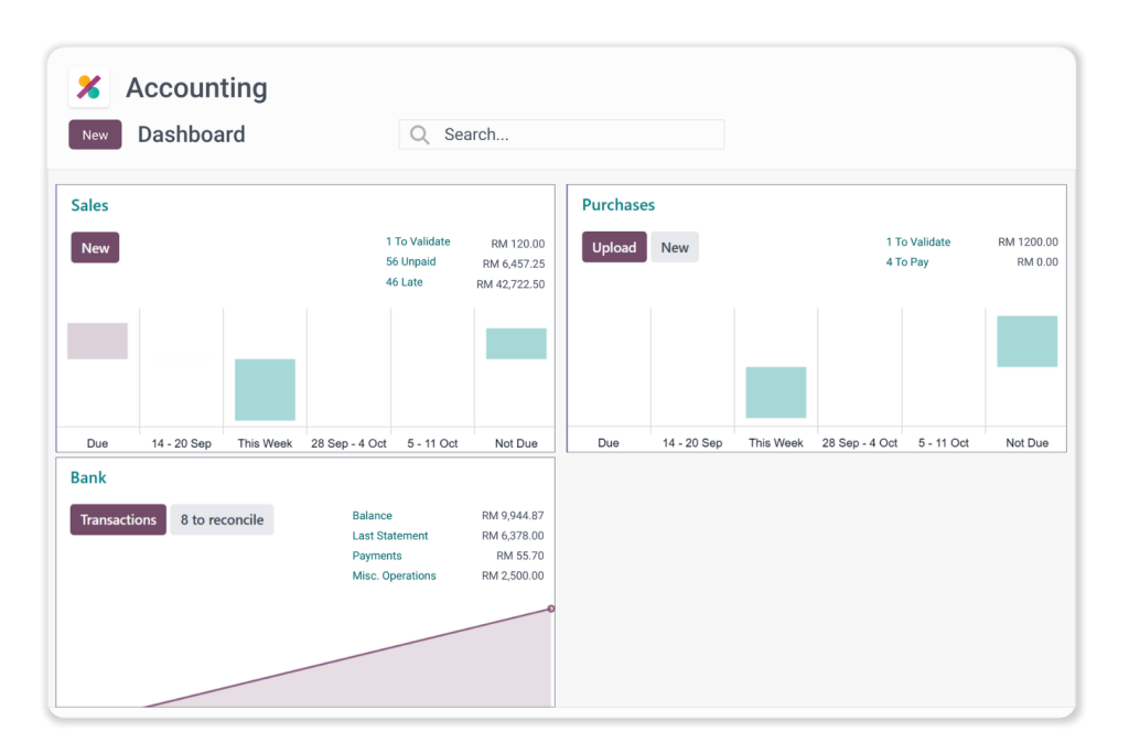 • Gain real-time accounting insights with a customizable dashboard provided by the Odoo Accounting app.