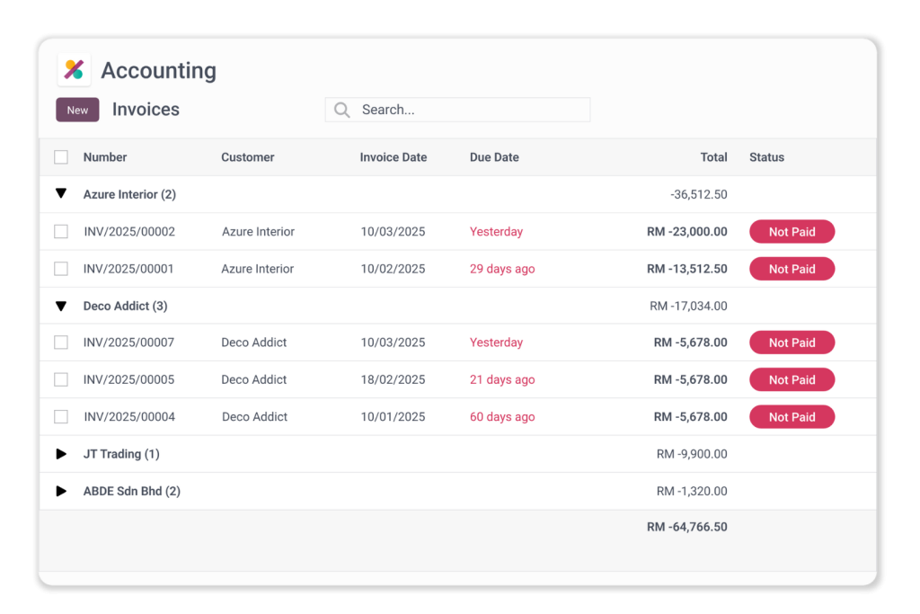 • Identify all overdue invoices and customers’ total overdue amounts in a single, comprehensive report.